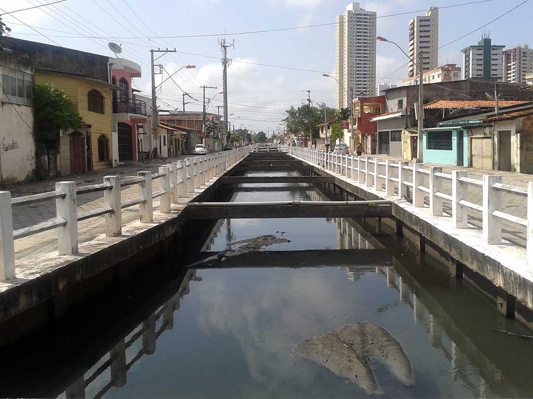 O volume de água precipitada escoa nos dispositivos da microdrenagem (sarjeta, boca de lobo, tubo de ligação, galeria) até canal de drenagem. Na imagem pode ser observado trecho do Canal de Drenagem da Tv. Dr. Moraes – Belém/PA.